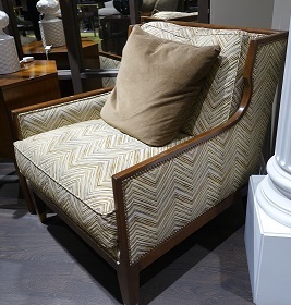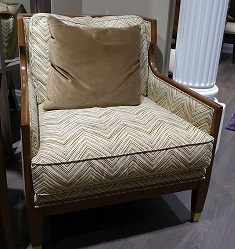 Кресло из коллекции French Deco - Larry Laslo для американского бренда Chaddock. Размеры w83 d94 h100см, Деревянные элементы в отделке орех, обивка ткань с геометрическим орнаментом в коричнево золотистых тонах, декоративные гвоздики и отделка ножек - латунь