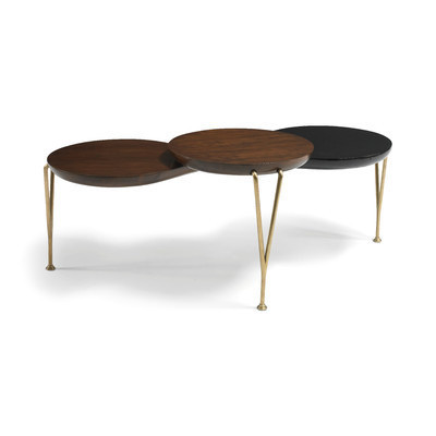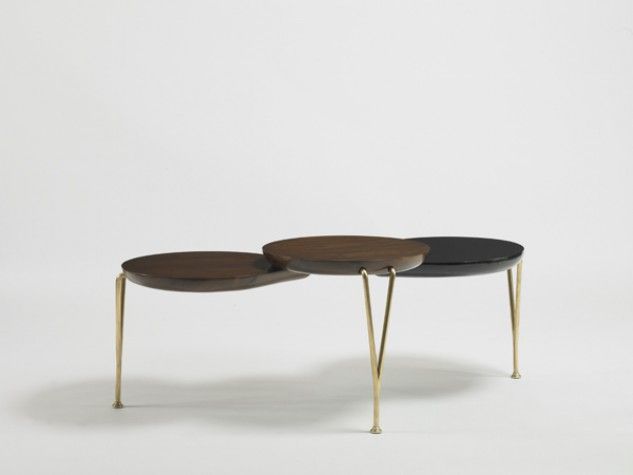 Коктейльный столик Crawford из коллекции DwellStudio. Размеры w140 d76 h50см, но 3 секции столика соединены между собой подвижным креплением, что позволяет изменять форму столика. Все 3 столешницы выполнены в разных вариантах отделки: 2 вида ореха и глянцевый черный лак, скульптурные ножки отлиты из латуни.