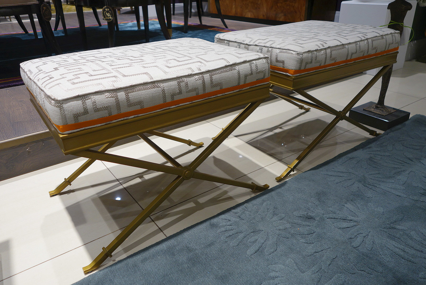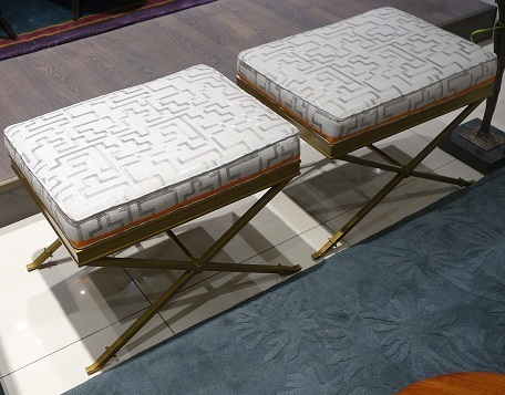 Пф-скамейка Lille из интерьерной коллекции Suzanne Kasler® (Hickory Chair). Размеры 49cm h x 66cm w x 46cm d. Изящная структура этой компактной скамеечки выполнена из латуни. Обивка из льна натурального оттенка с вышивкой в виде геометрического орнамента. По периметру подушка сидения украшена оранжевым кантом.