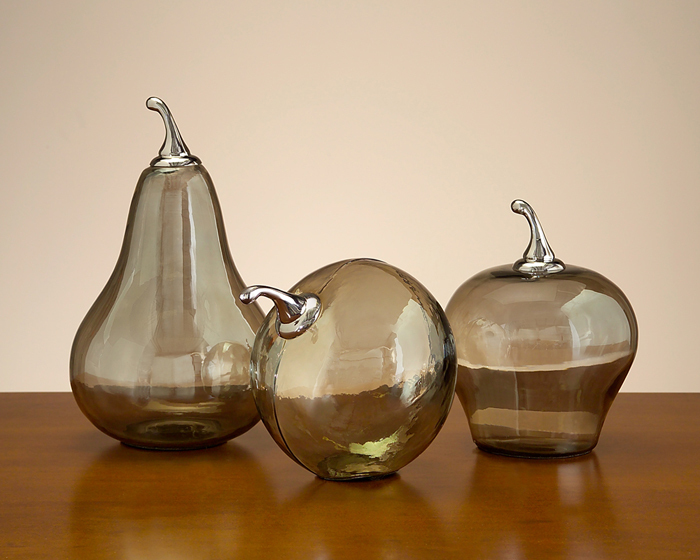 Фрукты из дымчатого стекла с никелированными деталями от John Richard. Размеры Peach:18Hx20Wx18D, Apple: 23Hx15Wx15D, Pear:30Hx20Wx20Dсм.