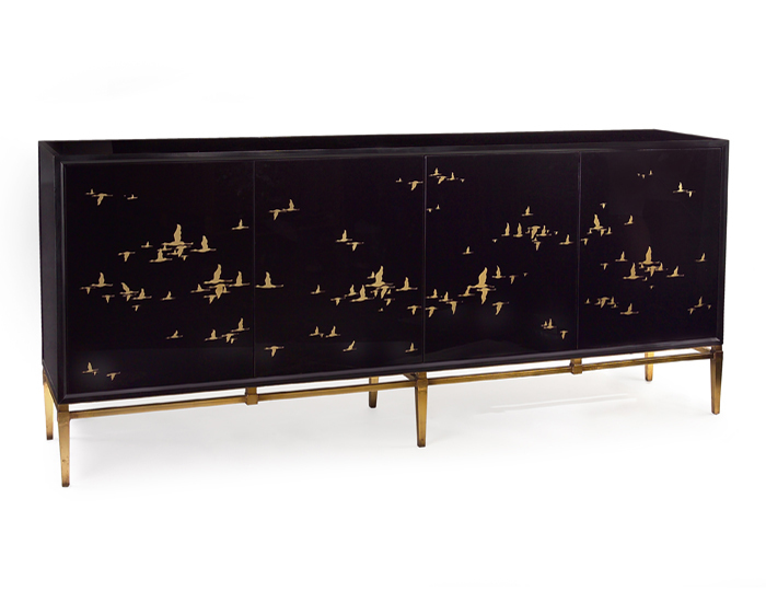 тумба Migration Four Door Credenza из коллекции John Richard. Размеры w224 d48 h98см. Структура дерево, фасады из черного стекла украшены рисунком "золотые перелетные птицы", ножки металл в покрытии старое золото.